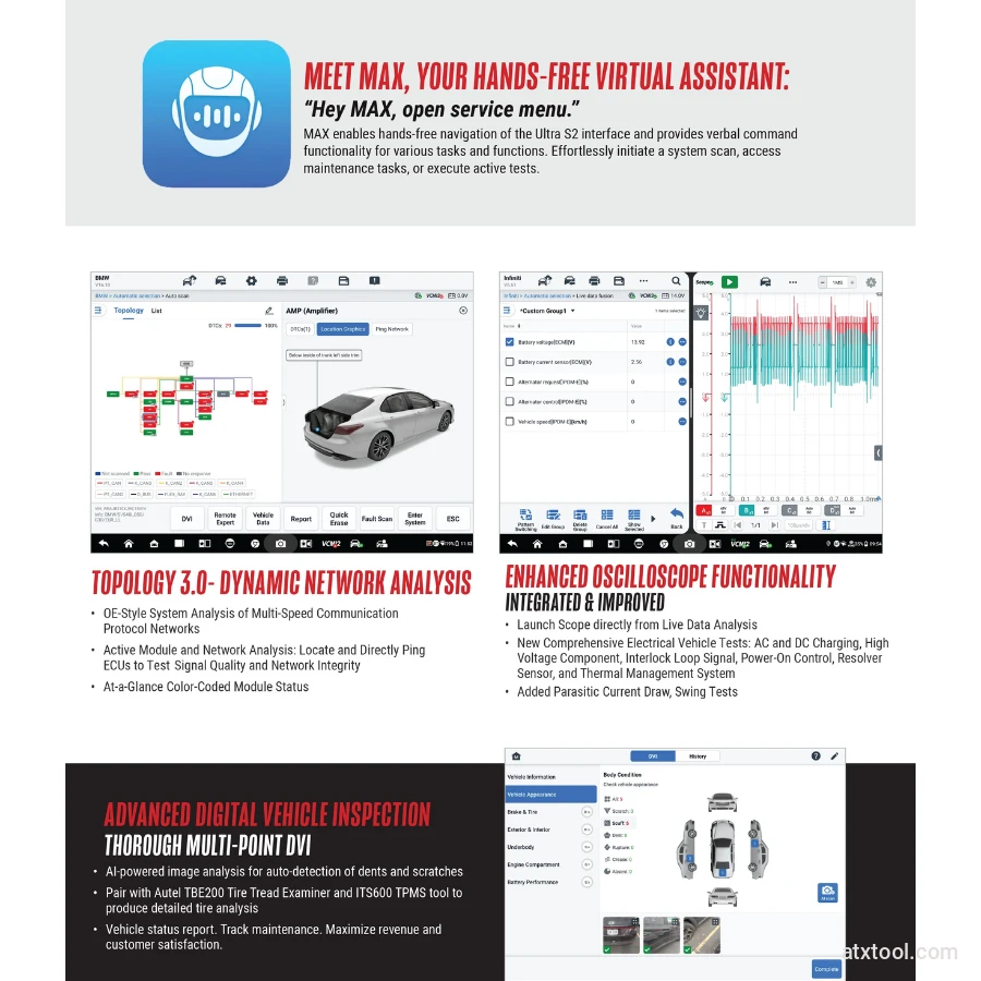 MAX Virtual Assistant: Offers hands-free operation via voice commands to initiate system scans, access service menus, and perform active tests effortlessly.