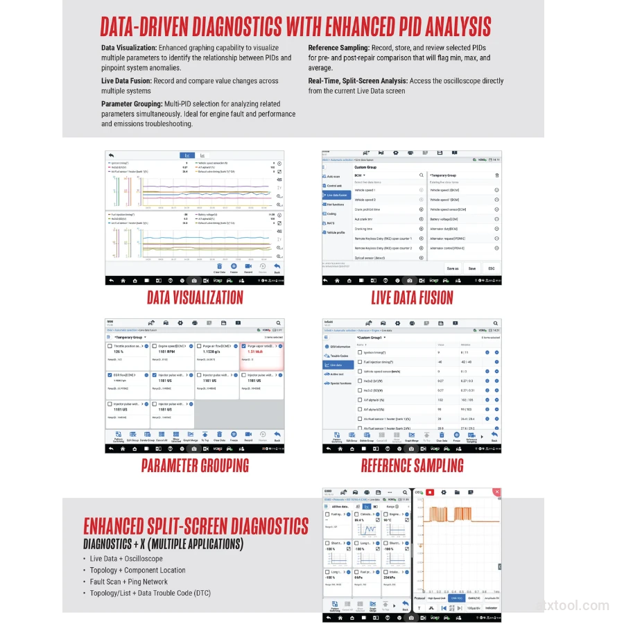 Data-Driven Diagnostics: Features enhanced PID analysis and Live Data Fusion, allowing technicians to visualize multiple parameters simultaneously to pinpoint system anomalies.